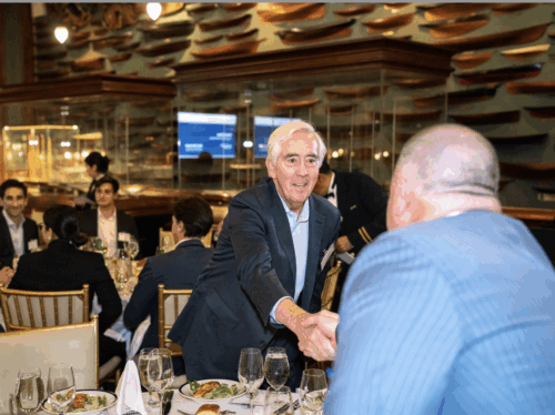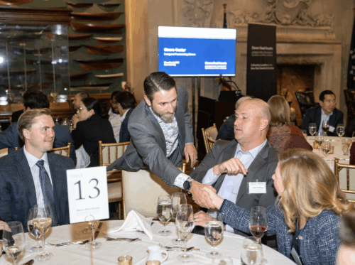 On November 5th, the New York Yacht Club in midtown Manhattan played host to 170 Georgetown alumni and friends of the Steers Center for the first annual Steers Center fundraising dinner. The evening featured a fireside chat with Jon Cheigh (P’29), president and chief investment officer at Cohen & Steers, along with the presentation of our inaugural Steers Center Distinguished Service Award. The inaugural award was presented to Larry Botel (B’88, P’23), managing partner at JOSS Realty Partners, LLC, an individual who has had a unique and special impact on the M.S. in Global Real Assets program at Georgetown McDonough from its earliest days.